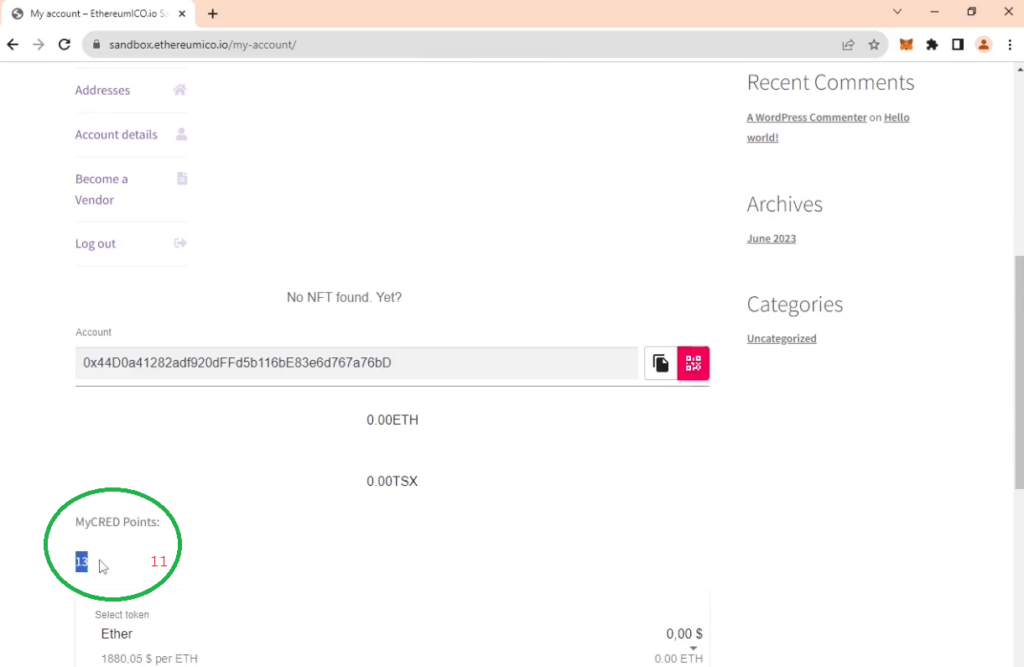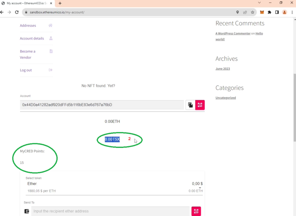 2 на втором скриншоте мы видим баланс TSX-0 и MyCred Points – 15 (смотрите второй скриншот)