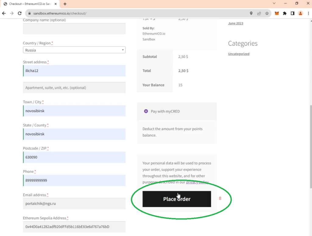 8 переходим к оплате. нажимаем кнопку Place order (смотрим восьмой скриншот)